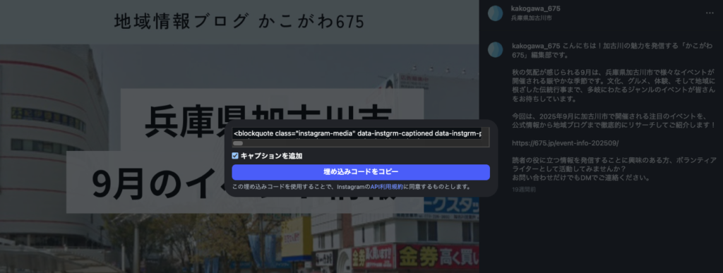 Instagramの埋め込み機能を使って、投稿をまるごとブログに掲載できます。